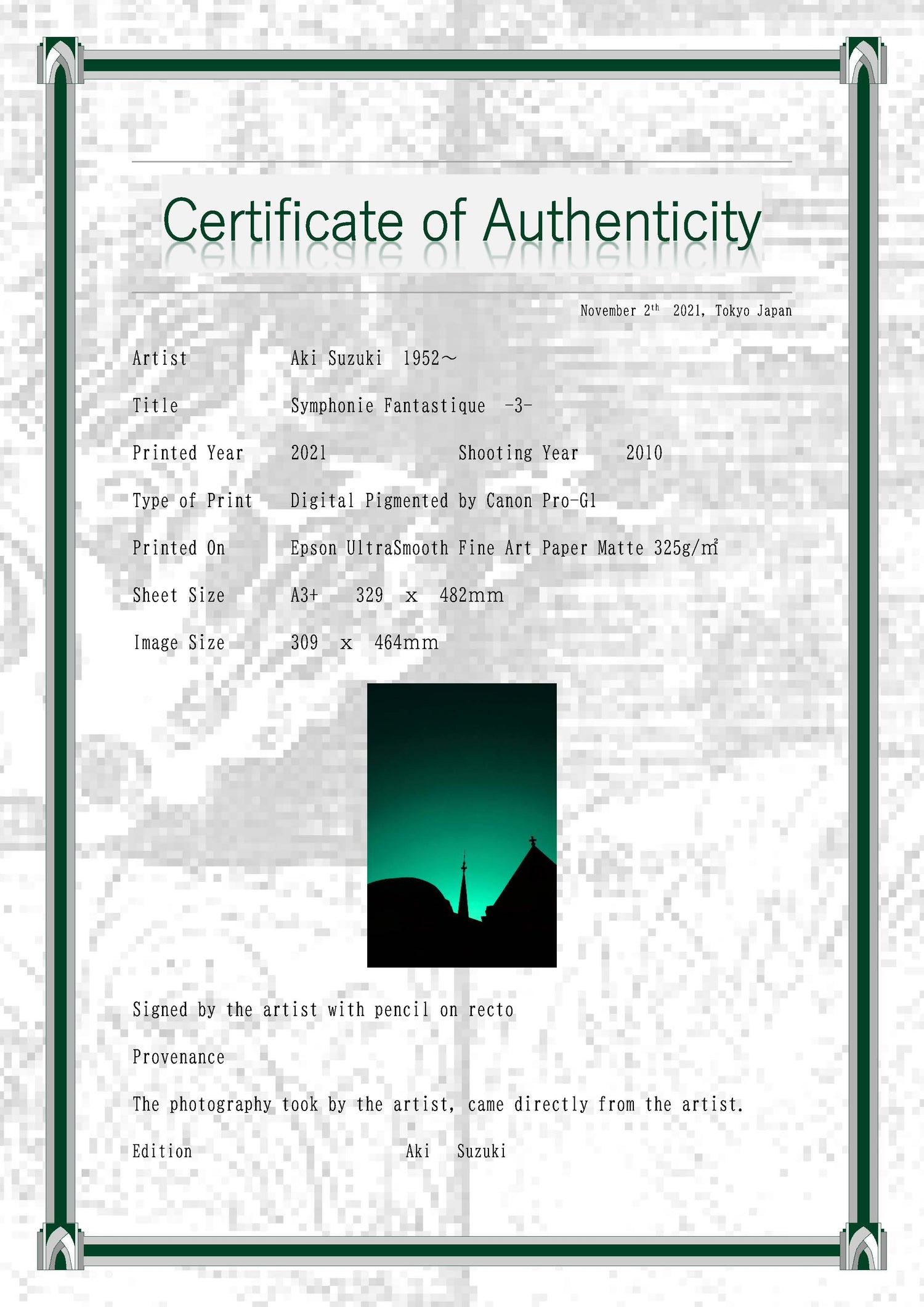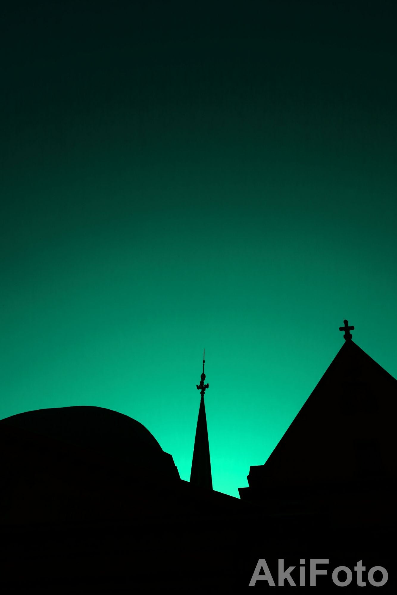 ここはジュネーブの旧市街のさらに中心部、シテ サントル。サン・ピエール大聖堂の屋根、尖塔。夕刻の青空が背景で大聖堂の壁面は黄褐色がオリジナルの色合い。データ現像処理の最後の段階で青空を思い切って鮮やかなグリーンに、建物をシルエットにしてみた。グリーンにすることによって一気に幻想的なイメージがでて思惑通りに仕上がった。