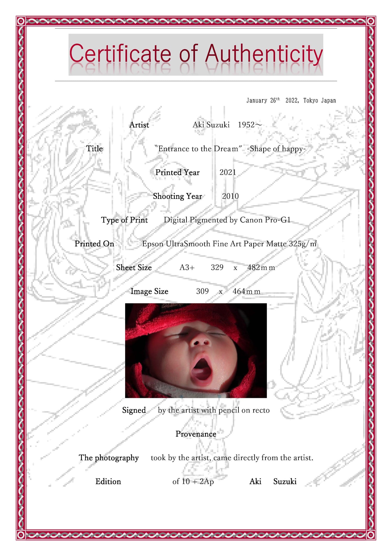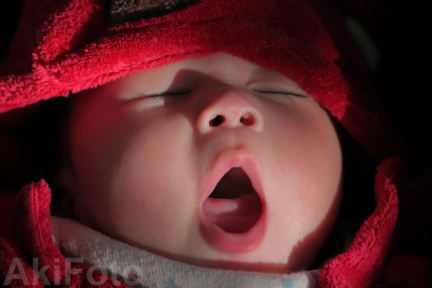 あくびをしていてもポートレート。しかも横のレイアウト(通常ポートレートは縦位置で、胸元までを含める)。これまでにない作品として認められた。この作品の見どころは瞬間をとらえているところにある。あくびをしている赤ん坊の写真は結構あるようにも思うが、こういう瞬間を撮ろうとして撮れるものではない。そしてこのショットでは色合いも、ピントも、ライティングも、構図も完璧だ。フード付きの洋服の紅色やモサモサした生地のディテールもこの作品をアートにまで昇華させるのに一役かっている。しかし何といっても、このモデル生後4か月の男の子の安らかさが見る人に安堵感を与えてくれる。