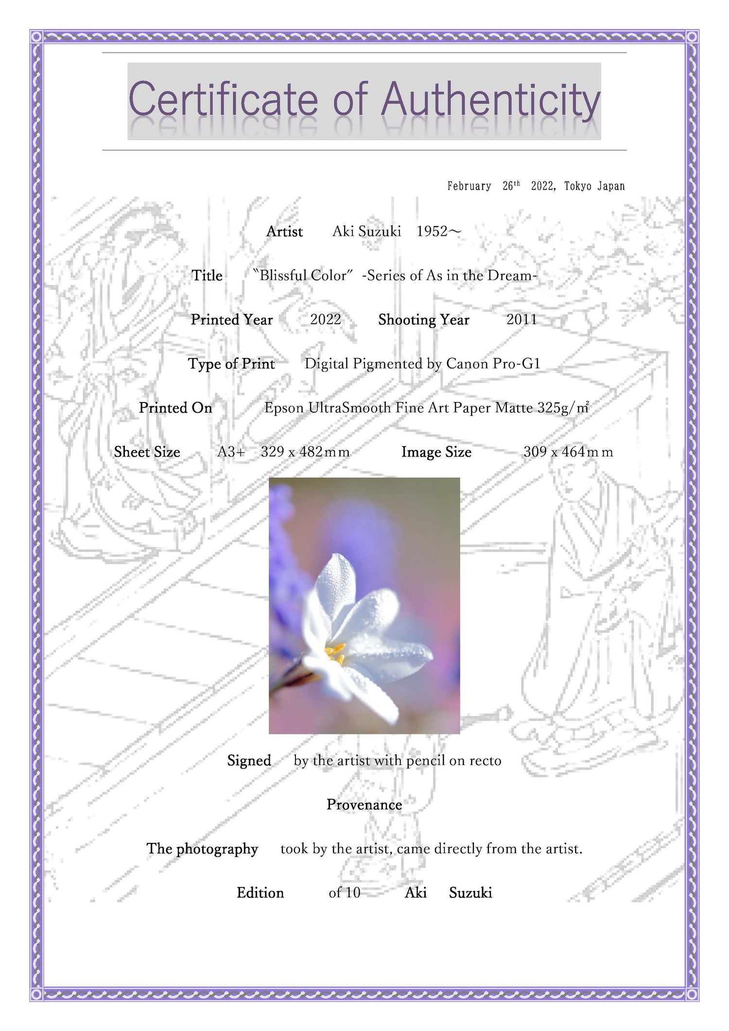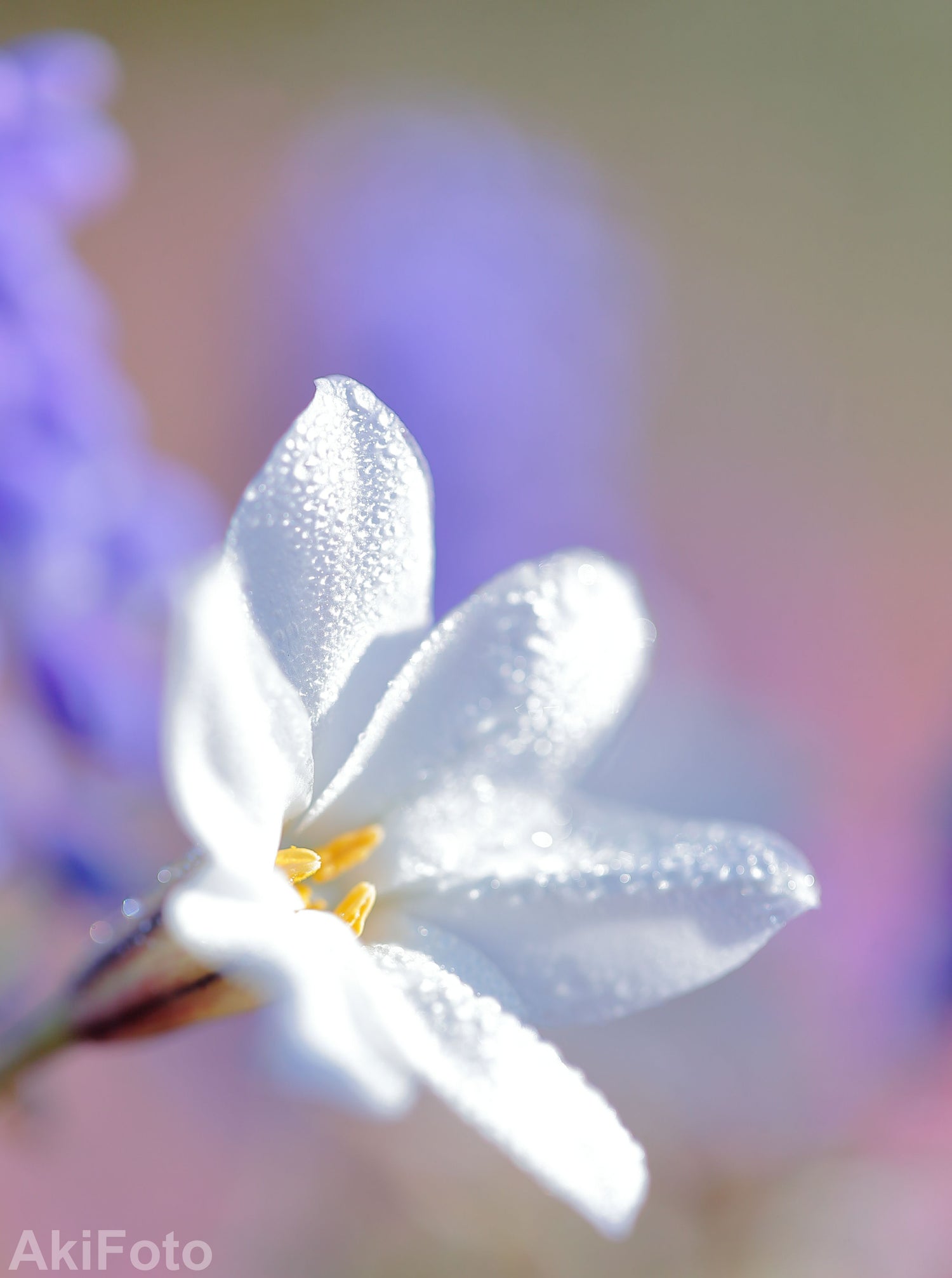 夢心地「至福の色」 雪解ユリ。はなの写真は仕上がりの全体の色合いがとても大事だ。少し濃い目のパープルとピンクのバックが純白の花びらをグッと引き立てている。そのバックのボケが非常にキツイ。正常の目の人に実物はボケては映らない。バックのボケは手前のメインの被写体の美しさを強調してくれる。さらにボケは曖昧さ/ファジーさを表現してくれる。現実に無い程の曖昧さから否生活感を感じる。なので心地よい。春先の早朝に瑞々しい朝露が朝日に光っている。花の写真は相手が止まっているから簡単だと想いがちだ。しかし、こういうシチュエーションには簡単に会えるものではない。因みに私に同じ写真を撮れと言われてもまず無理と思う。雪解ユリ。素敵な名だ。春先に草花達が一斉に咲き誇ろうとするほんの少し前に開花する。ユリの名ははついているけれど花の一輪は2㎝程の小さな物で丈も15㎝程しかなく可憐だ。こんなに小さな命が私たちを癒してくれる。何という凄いパワーだ。
